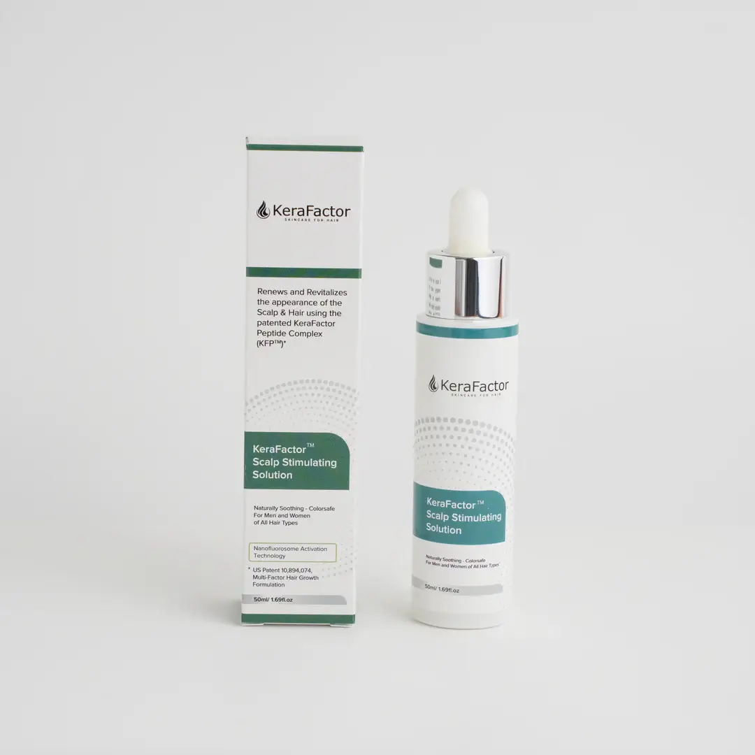 Each highly concentrated 50ml bottle of KeraFactor Solution contains the proprietary KeraFactor Peptide Complex (KFP™). KFP is unique in that it contains 7 Polypeptides that include both specifically selected growth factors and skin proteins to help with hair and scalp health. This patented complex helps to “turn on” weak or resting hair follicles and improve scalp circulation and nutrients to produce thicker, longer healthy-looking hair.