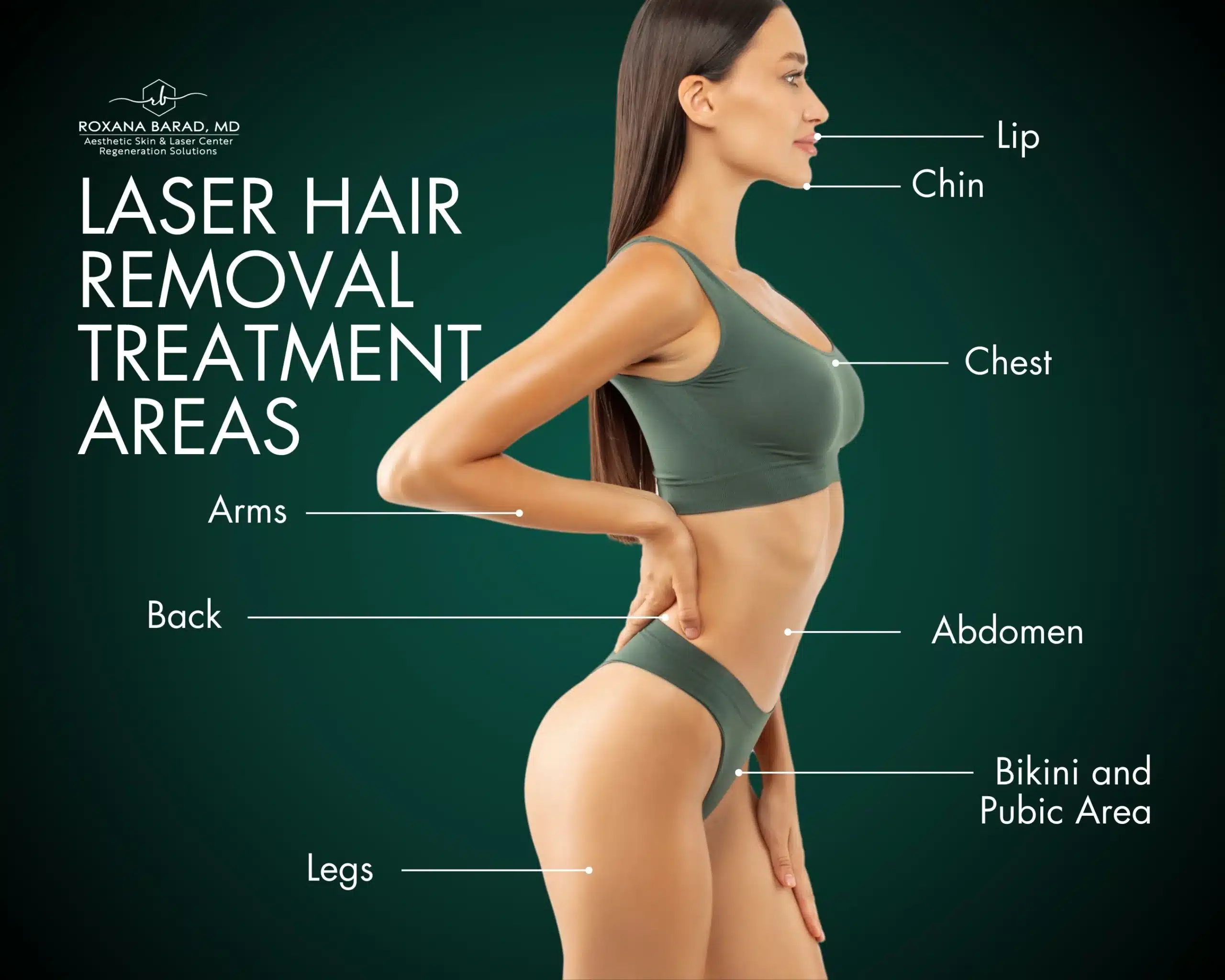 Laser hair removal can be used on almost any part of the body, including the face, arms, underarms, bikini line, legs, back, and chest.